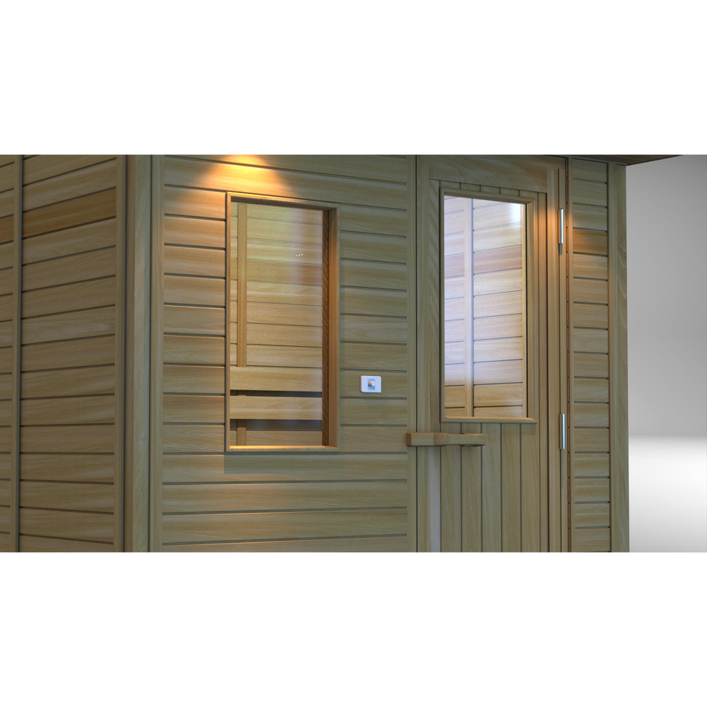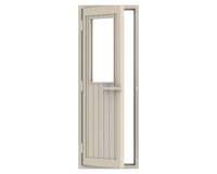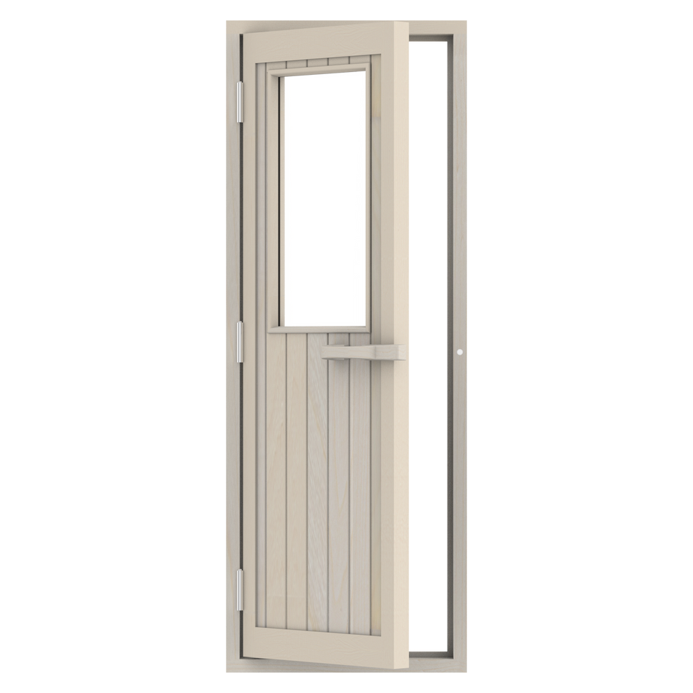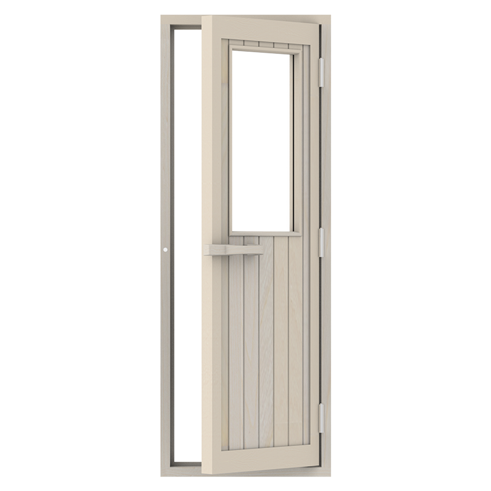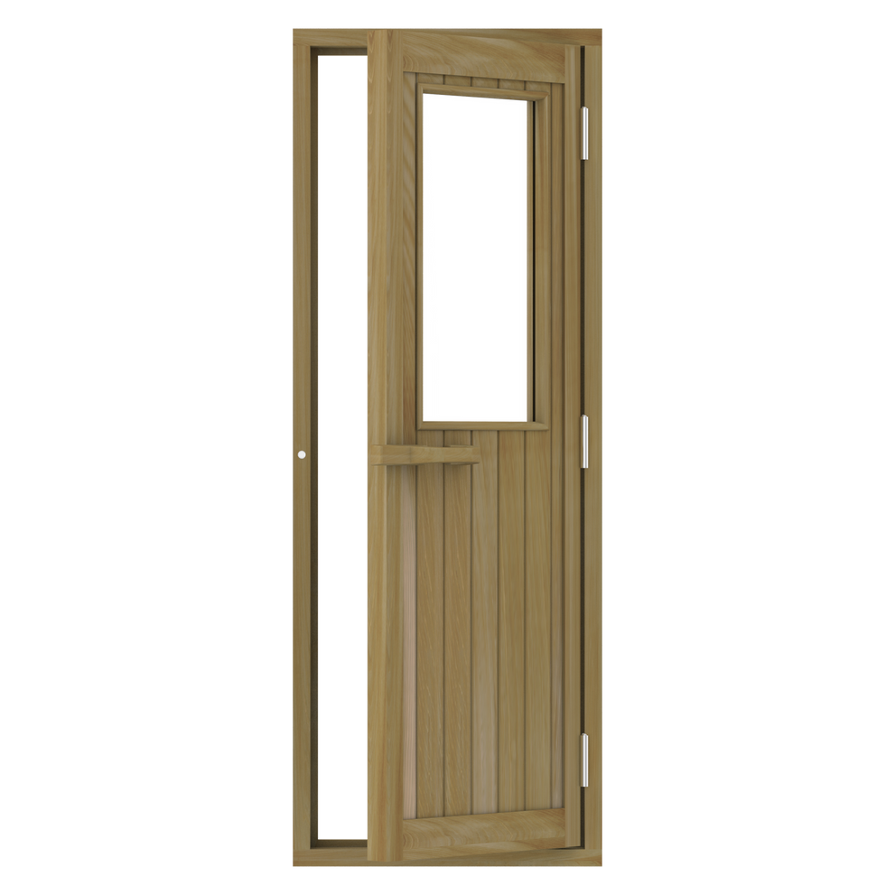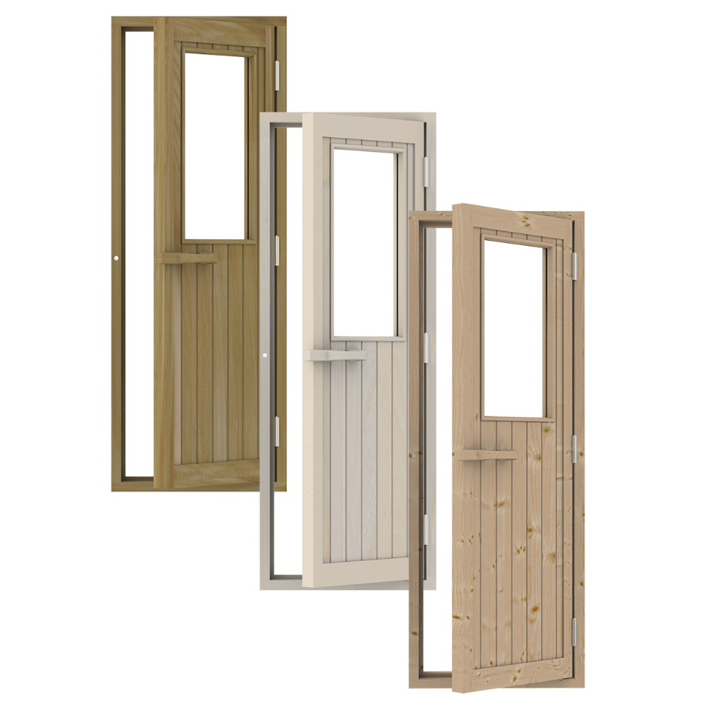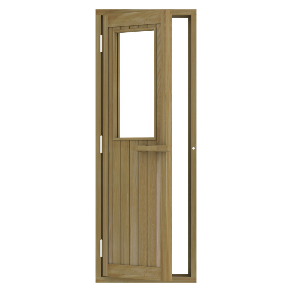 De deur is verkrijgbaar in verschillende houtsoorten, waaronder Ceder, Espen en Spar, die elk een unieke uitstraling en geur aan uw sauna geven. Het helder glas raamvenster is stevig en zorgt voor een uitstekende zichtbaarheid, terwijl het de privacy behoudt die nodig is in de sauna.