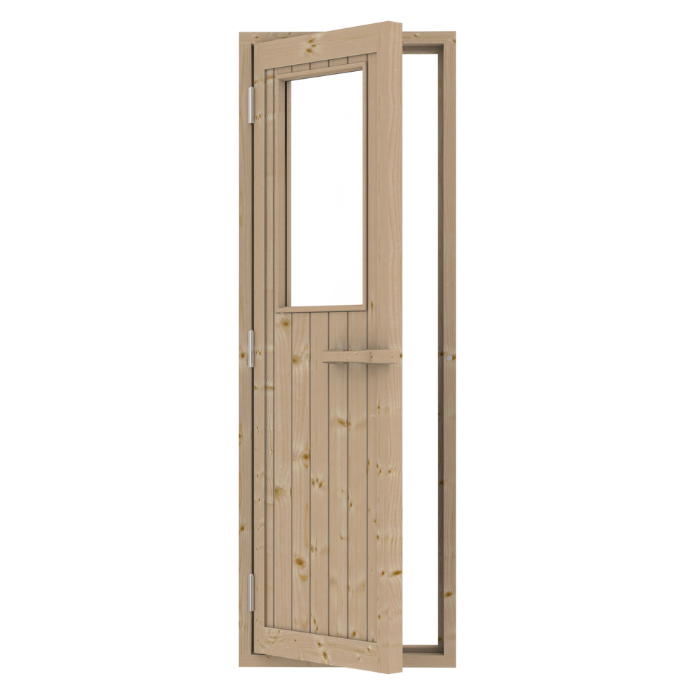 De deur is beschikbaar in zowel een links- als rechtsdraaiende variant, zodat u de deur kunt plaatsen op de manier die het beste past bij de indeling van uw sauna. De afmetingen van de deur zijn: